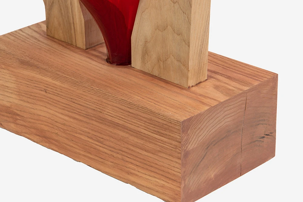 Breathe In is made from ash, Douglas fir, oak, reclaimed wood and hand-blown glass. This unique sculpture is hand-painted in water-based paint and finished in a clear, natural lacquer.