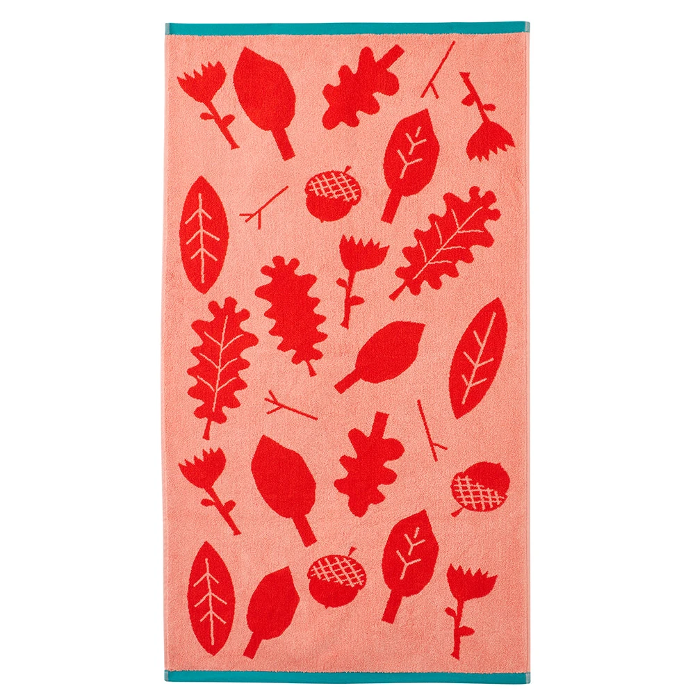Our Sprig Towels are adorned with a red and pink oak leaf design with contrasting turquoise trim. Made from super-soft, absorbent cotton, they’ll be right at home in your bathroom, at the gym, or take to the beach for a swim!